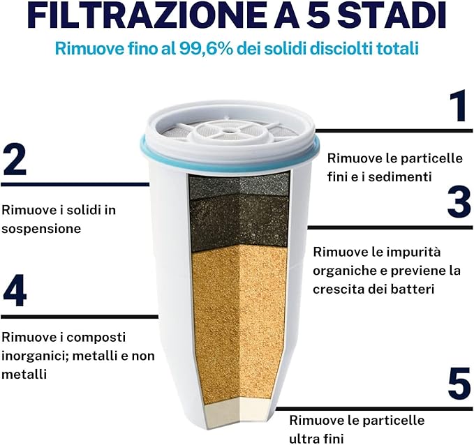 - Sistema di filtrazione a 5 fasi: Utilizza una combinazione di tecnologie, tra cui la filtrazione a scambio ionico e carboni attivi, per eliminare fino al 99,6% dei solidi disciolti totali (TDS), inclusi piombo, mercurio, cromo, PFAS, cloro e calcare .